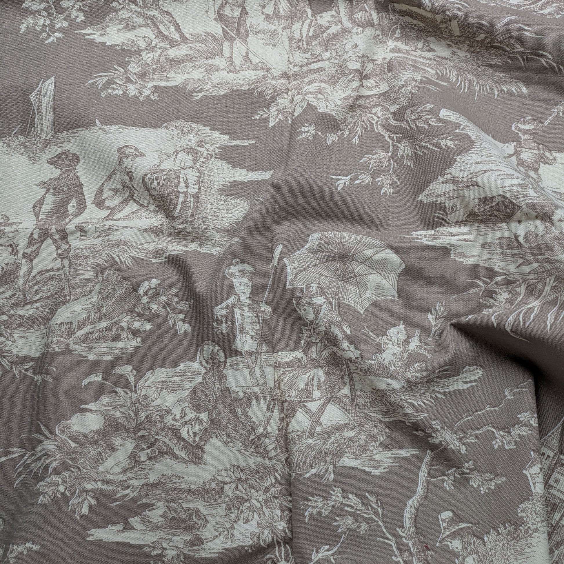 Maison Thevenon's famous Toile de Jouy, Histoire d'Eau, in their Sepia background on linen. 56" wide and 1.6 yards (59") long.