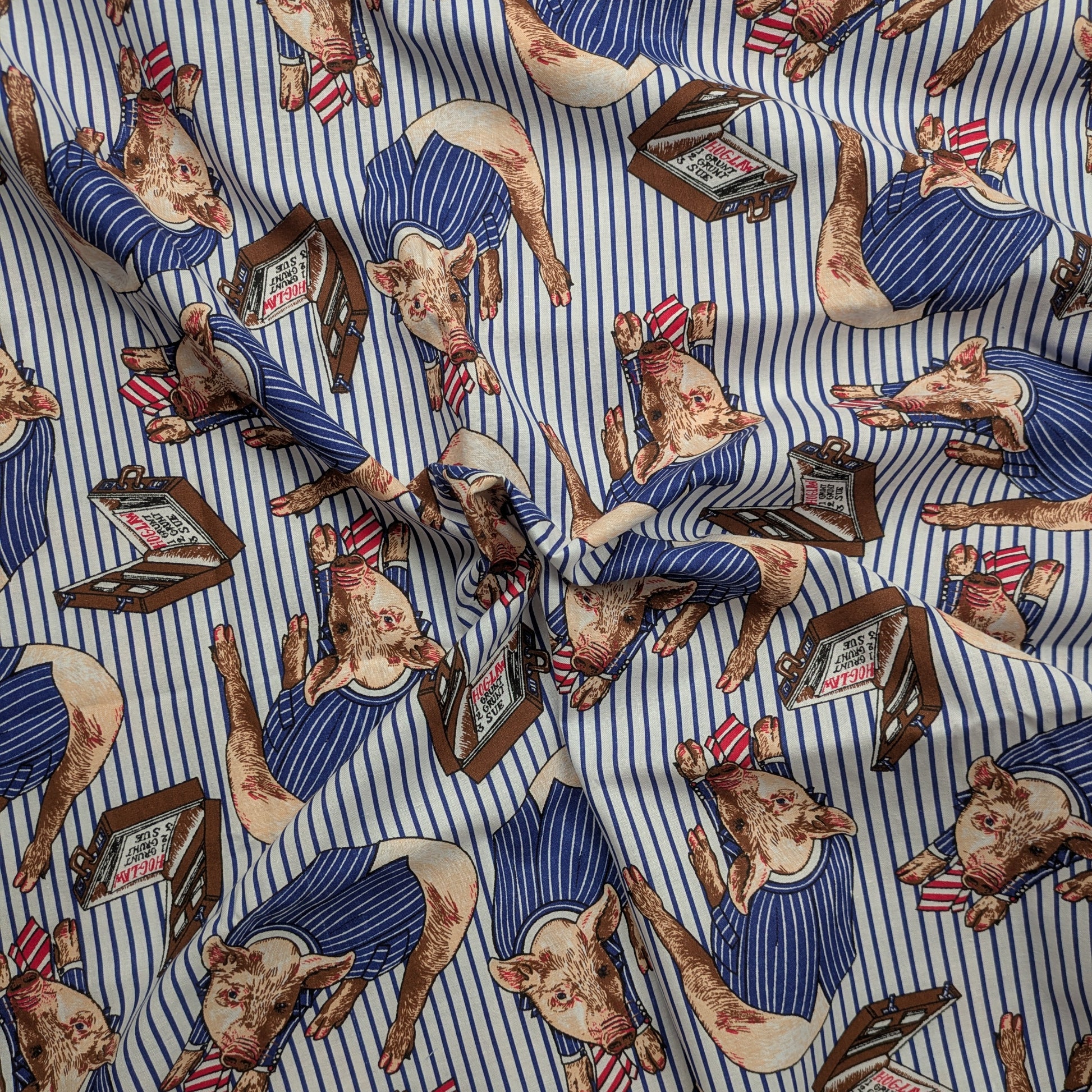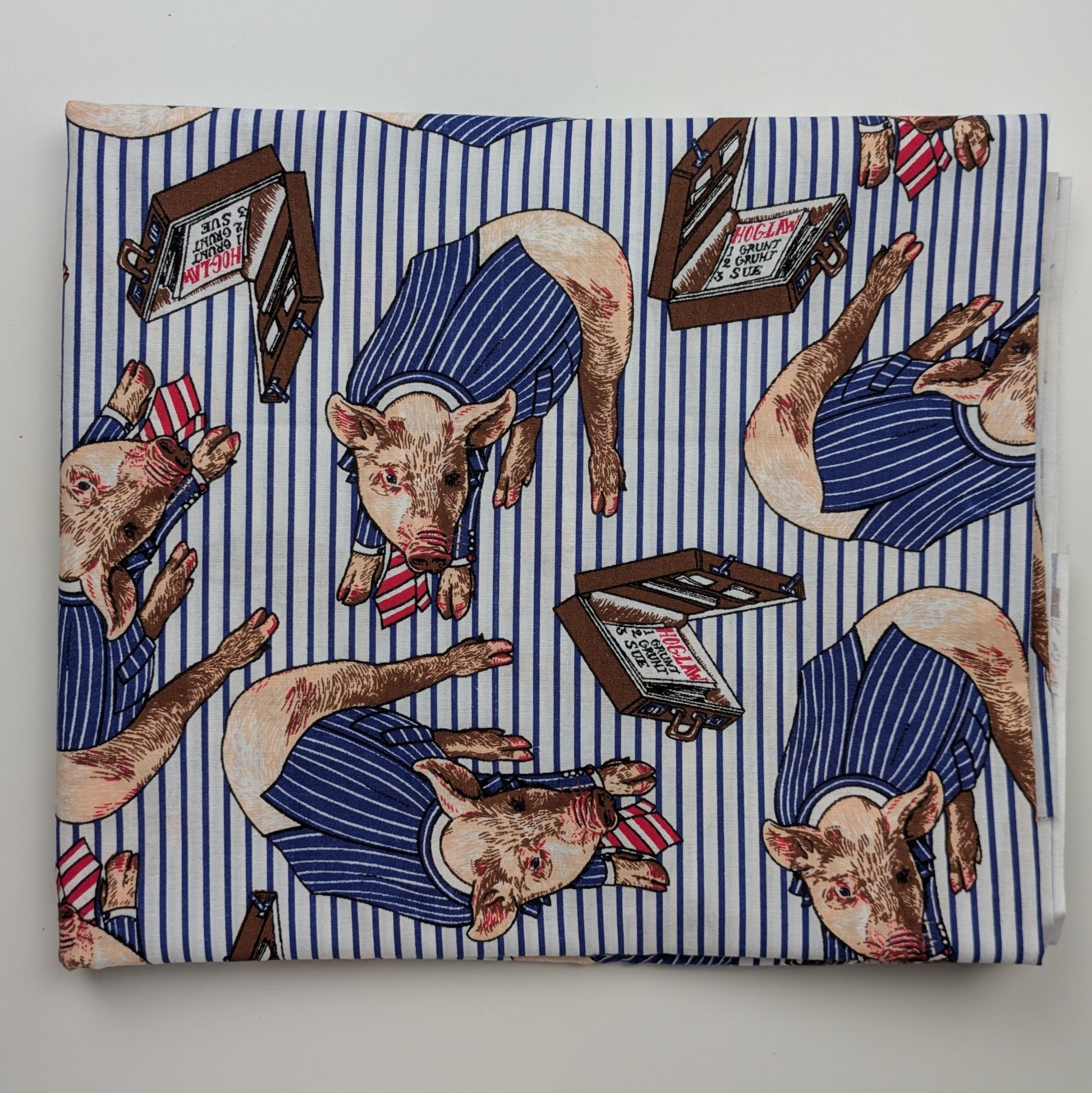 2.25 yards long and 44" wide, cotton. Grunt, grunt, sue! This is one of the weirdest fabrics I've ever seen, but I love it dearly.